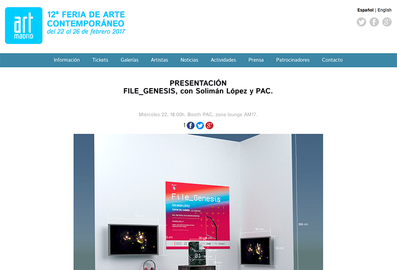La feria de Arte Contemporáneo Art Madrid ha propuesto como actividad complementaria a la feria, un completo contenido de #ARTEYTECNOLOGIA en el que ESAT y Solimán López es invitado a participar en colaboración con la Plataforma de Arte Contemporáneo PAC, quién ha cedido su espacio para que el director de ESAT LAB muestre el proyecto File Genesis desarrollado en ESAT.