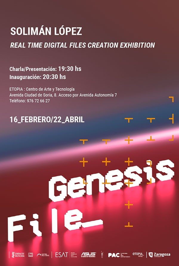 El próximo día 16 a las 18:30 horas, Solimán López inaugura el ciclo Arte y Archivos Digitales en Etopía: Centro de Arte y Tecnología de Zaragoza, con la exposición File Genesis que ya estuvo expuesta en la Sala Dormitorio del Centre del Carmen de Valencia hasta el pasado 20 de Enero y que pretende analizar de un modo global el arte digital.